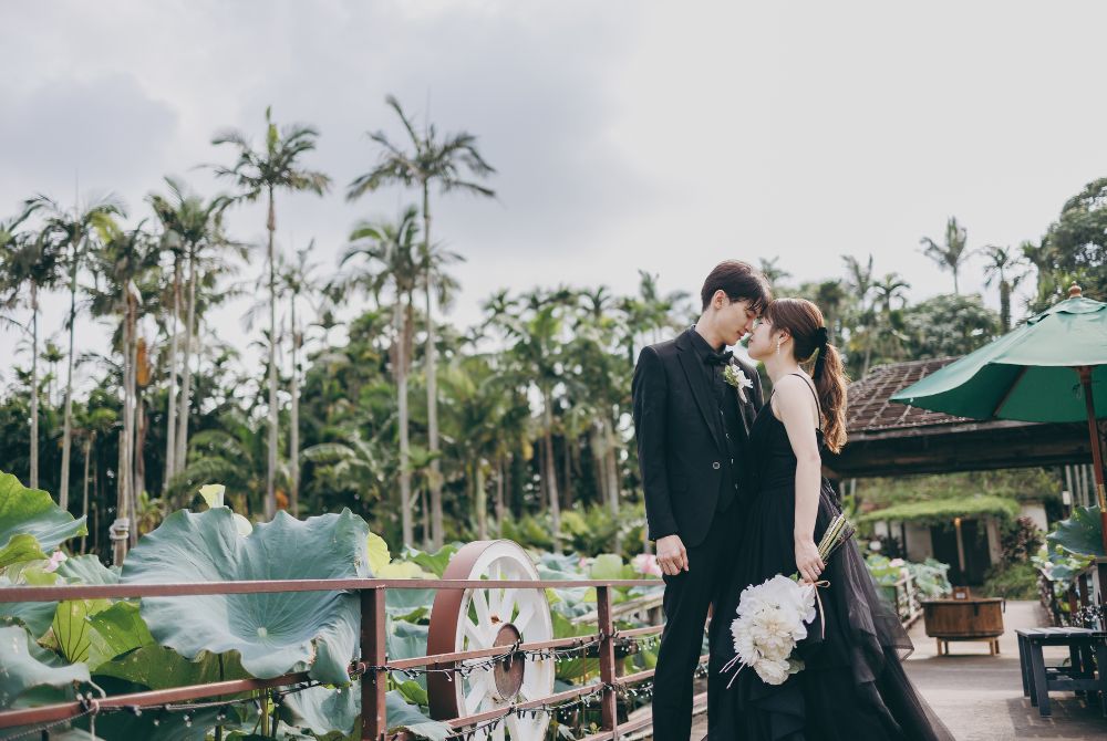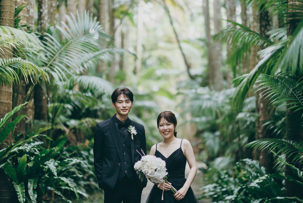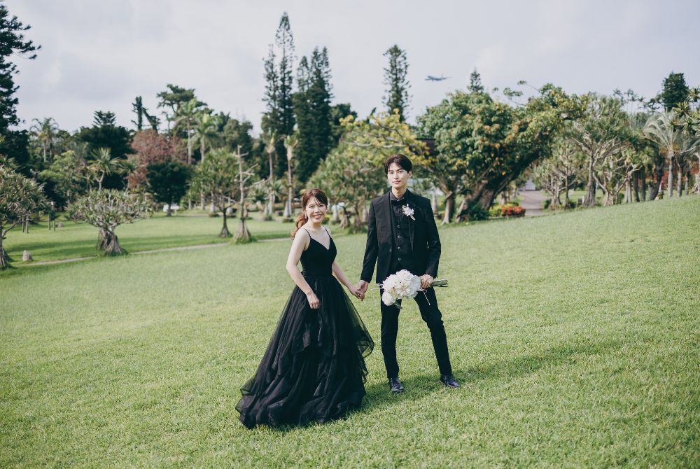 新婦様は、Dress No.76のストラップ付きブラックドレスをセレクト。ブラックドレスに合わせて、新郎様はブラックタキシードをチョイス。