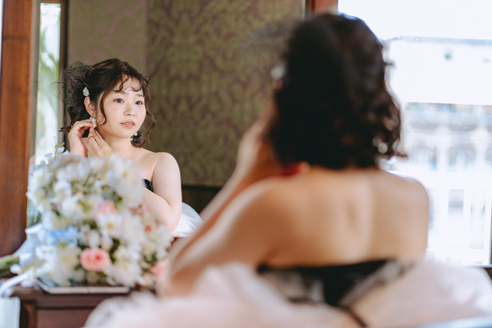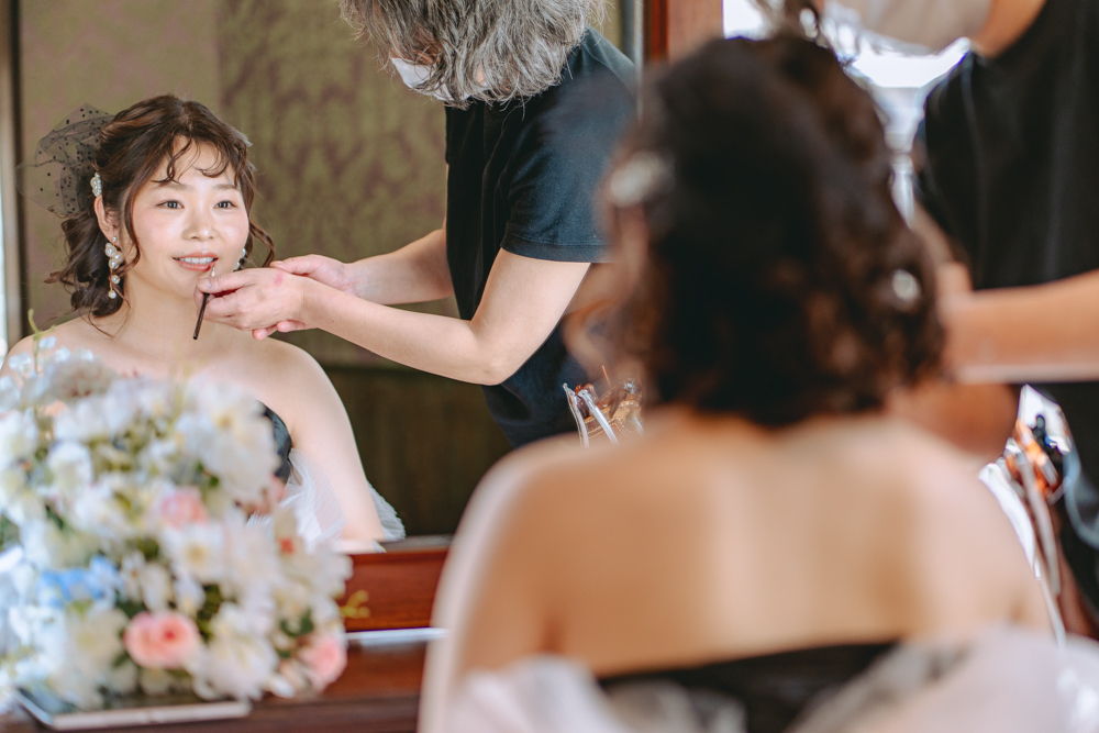 撮影のスタートは、琉球ウェディング提携の那覇スタジオでのお支度から。落ち着いたプライベート空間で、経験豊富なヘアメイクスタッフが衣装やロケーションに合わせて丁寧に仕上げます。
