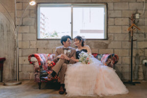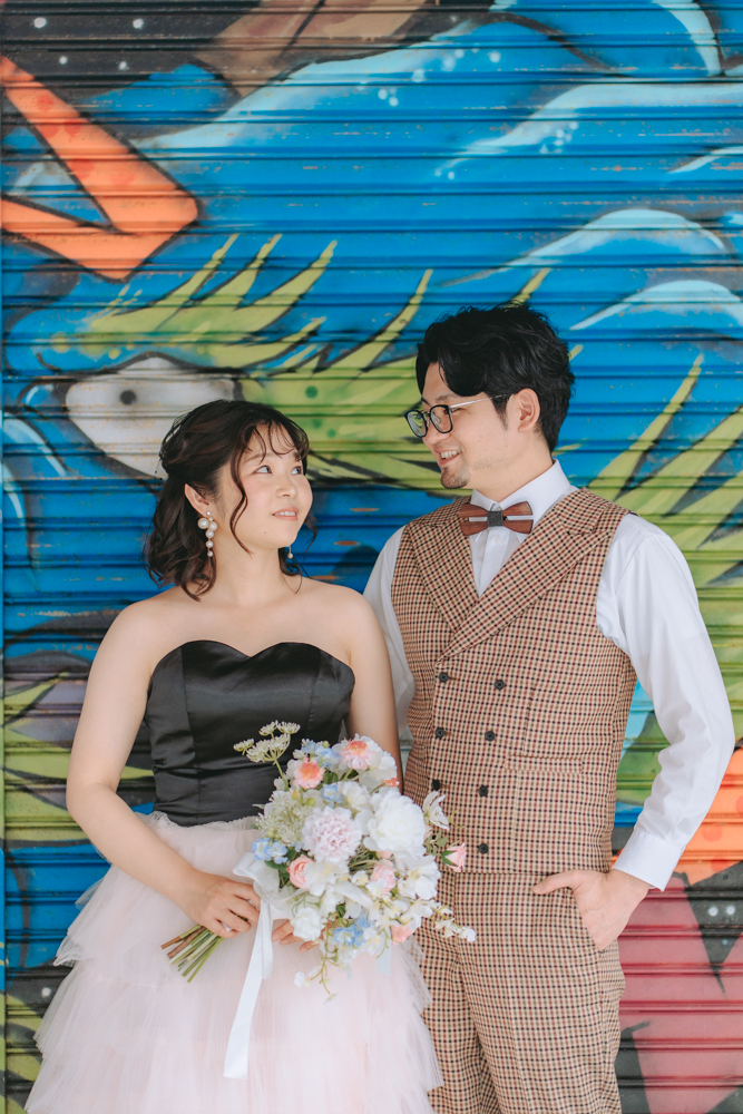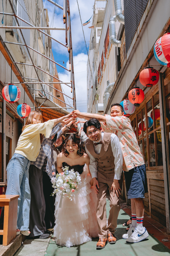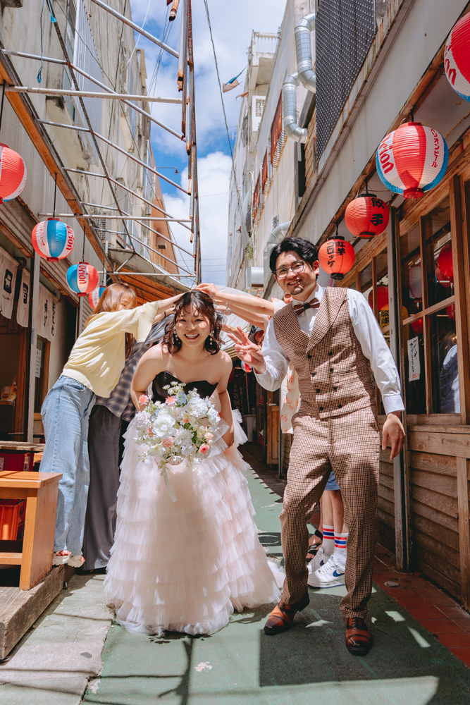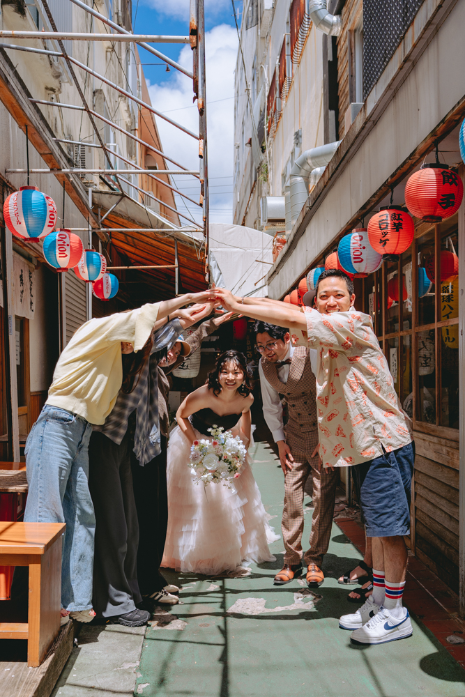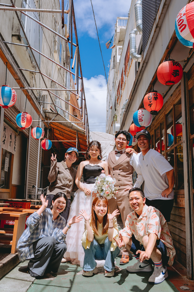 気心の知れた仲間に囲まれた姿は、フォトウェディングならではのあたたかくリアルなワンシーン。特別な日常の延長として、地元で過ごす今のおふたりらしさを大切に残しました。