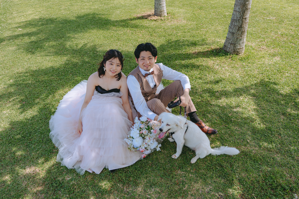 開放感あふれる景色の中、リラックスした表情や何気ない仕草もそのまま写真に残していきます。大切な家族であるペットも一緒に参加し、笑顔が絶えない和やかなひとときに。自然体のおふたりらしさが詰まった、あたたかなフォトウェディングとなりました。