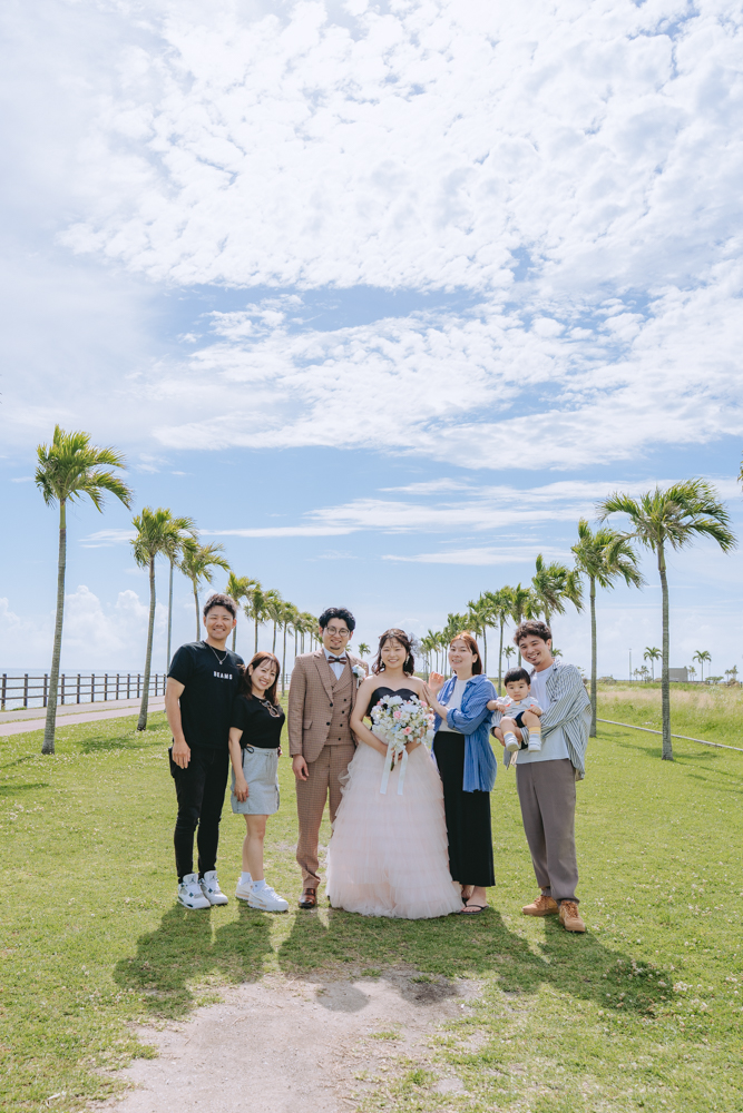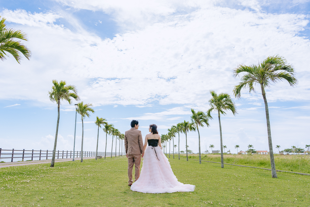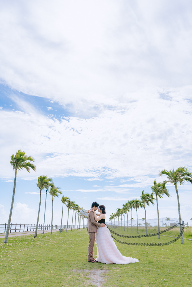 青い海と白い砂浜が広がる美らSUNビーチでのロケーション撮影。今回はおふたりのご希望に合わせて、芝生や木々などグリーンを多めに取り入れ、自然のやわらかな彩りを感じられるカットを中心に撮影しました。