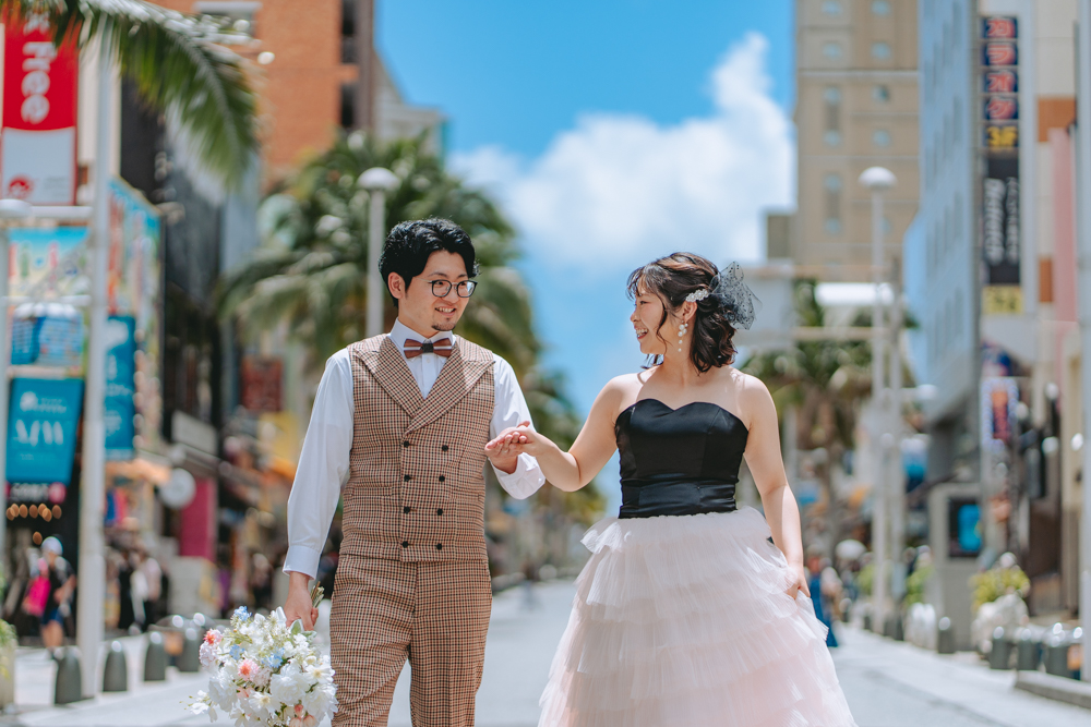 那覇の提携スタジオでのお支度からスタートし、国際通り周辺のストリート撮影、そして開放感あふれるビーチフォトへ。街も海も楽しめる「ちゅら那覇ストリート+ビーチ」は、沖縄らしさを一度に満喫できる人気プランです。