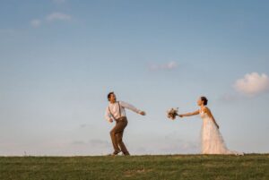 カップルが野原で追いかけあう