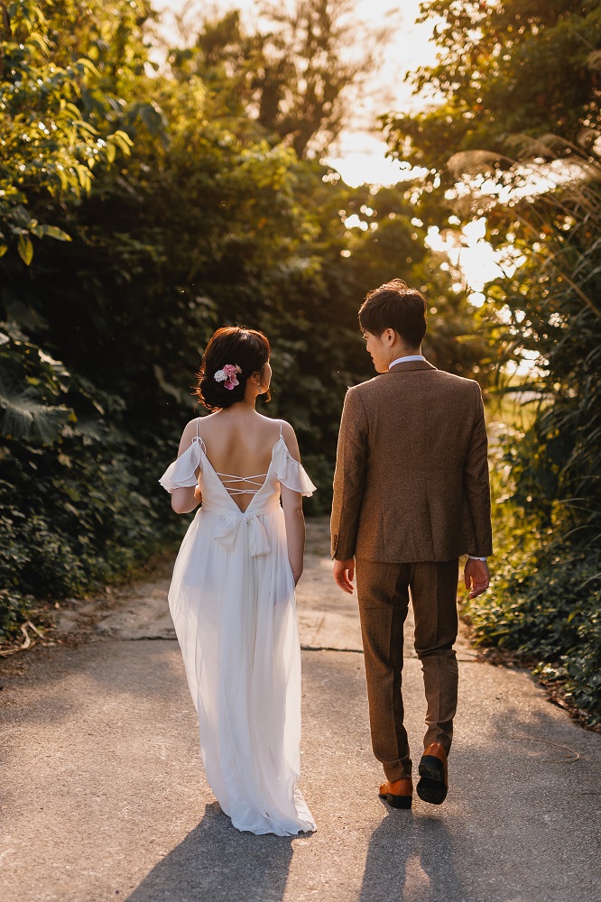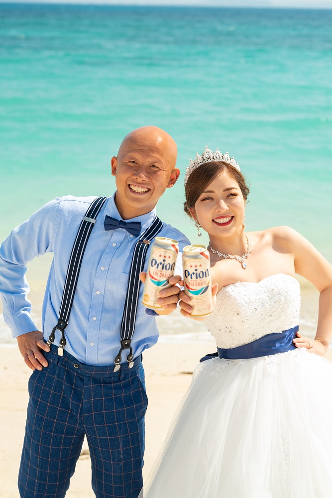 ビーチ撮影中、ちょっとのアレンジもOK! 男性はベストを脱いでサスペンダー、 そしてご持参のドレスのリボンは男性衣装の色と合せたコーディネート☆