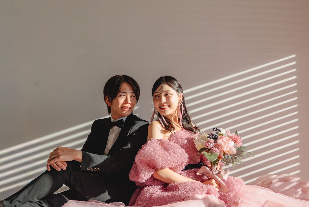 新婦様の淡いピンクのドレスがスタジオで美しく映え、