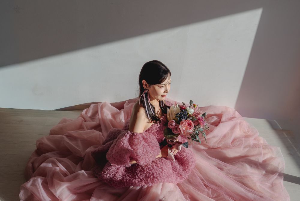可憐な花びらのようにドレスを広げて。柔らかな光に包まれたスタジオでがふわりと花開くように華やぐ一枚。上品さと可憐さが溶け合う、特別感あふれるショット。